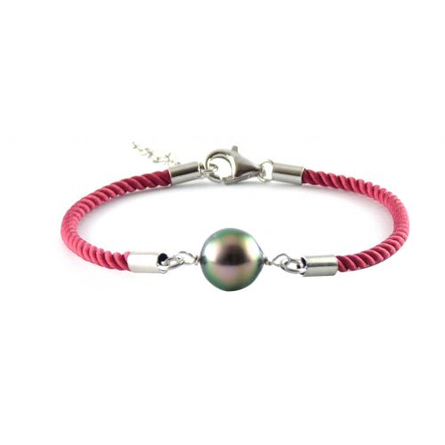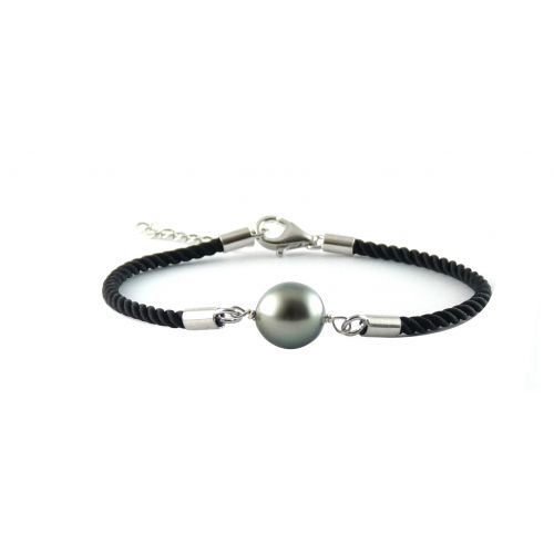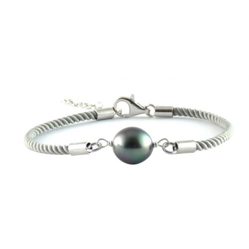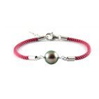 Bracelet coton et fermoir, bellière en argent - perle de culture de Tahiti